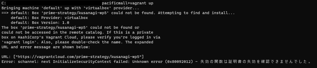 C:\pacificmall>vagrant up Bringing machine 'default' up with 'virtualbox' provider... ==> default: Box 'prime-strategy/kusanagi-wp5' could not be found. Attempting to find and install... default: Box Provider: virtualbox default: Box Version: 1.0 The box 'prime-strategy/kusanagi-wp5' could not be found or could not be accessed in the remote catalog. If this is a private box on HashiCorp's Vagrant Cloud, please verify you're logged in via `vagrant login`. Also, please double-check the name. The expanded URL and error message are shown below: URL: ["https://vagrantcloud.com/prime-strategy/kusanagi-wp5"] Error: schannel: next InitializeSecurityContext failed: Unknown error (0x80092012) - 失効の関数は証明書の失効を確認できませんでした。 |