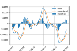 #MACDを記載する macd, macdsignal, macdhist = ta.MACD(close, fastperiod=12, slowperiod=26, signalperiod=9) #もう一度同じようにグラフを描画するように指示 fig2=plt.figure() ax=fig2.add_subplot(1,1,1) ln_a=ax.plot(macd,label='macd') ln_b=ax.plot(macdsignal,label='macdsignal') ln_c=ax.bar(macdhist.index,macdhist ,label='macdhist') ax.grid(True) ax.set_xlabel('DATE') ax.set_ylabel(r'indicator value') ax.legend() ax.tick_params(axis="x", labelrotation=45) fig2.savefig("BTC_MACD.png") |