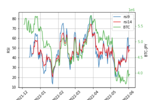 #日付を扱うライブラリとデータフレームを扱うPandasと上記のpandas_datareaderを読み込む import datetime import pandas as pd from pandas_datareader import data end = datetime.datetime.today() #後述でデータを引っ張ってくる最新の日を設定。今回は今日を指定 start = (pd.Period(end, 'D') - 180).start_time #今日から180日前までの日を指定 df = data.get_data_yahoo('BTC-JPY', end=end, start=start) #yahooファイナンスのティッカーコードを入力 #とりあえずグラフ化のライブラリを読み込む import numpy as np import matplotlib.pyplot as plt import pandas_datareader.data as web import talib as ta import matplotlib.pyplot as plt from matplotlib import cm from matplotlib.pyplot import MultipleLocator close = df['Close'] #終値のみ欲しいのでdf=データフレームから"Close"のみを抽出しcloseに入れる rsi9 = ta.RSI(close, timeperiod=9) #RSIを計算。今回は9 rsi14 = ta.RSI(close, timeperiod=14) #RSIを計算。今回は14 color_1 = cm.Set1.colors[1] #グラフにチャートを重ね書きするので、見やすい色を事前に指定 color_2 = cm.Set1.colors[2] #グラフにチャートを重ね書きするので、見やすい色を事前に指定 color_3 = cm.Set1.colors[0] #グラフにチャートを重ね書きするので、見やすい色を事前に指定 fig1 = plt.figure() #箱=描画領域を指定。走らせたときにこの箱に何個グラフを入れるか?を指定できる ax1 = fig1.add_subplot(1,1,1) #上記で箱作ったけど、今回は1個のグラフしか入れない ln1=ax1.plot(rsi9,color=color_1,label='rsi9') #上記で計算したRSI9と色指定、ラベル名はRSI9と表示するように記載 ln2=ax1.plot(rsi14,color=color_3,label='rsi14') #同上 ax2 = ax1.twinx() #グラフのY軸に第二軸を追加する(グラフの左縁じゃなくて、右縁に別のY軸を設ける) ln3=ax2.plot(close,color=color_2,label=r'BTC') #上記の第二軸にビットコインのY軸チャートを使う。X軸はRSIと共有 h1, l1 = ax1.get_legend_handles_labels() #グラフの凡例情報を取得指示 h2, l2 = ax2.get_legend_handles_labels() ax1.legend(h1+h2, l1+l2, loc='upper right') #凡例をグラフに記載 ax2.tick_params(axis='y', colors=color_2) #色が多いのでビットコインのチャートとY軸のメモリを同じ色で指示 ax1.grid(True) #グラフにグリッドを表示 ax1.set_xlabel('DATE') #X軸名をグラフに表示するよう指示 ax1.set_ylabel(r'RSI') #Y軸の第一軸(左側)をRSIと表示するよう指示 ax2.set_ylabel(r'BTC-JPY') ax1.tick_params(axis="x", labelrotation=45) #X軸の文字が被る時があるから45度傾ける fig1.savefig("BTC_RSI.png") #グラフをpngファイルで保存 |